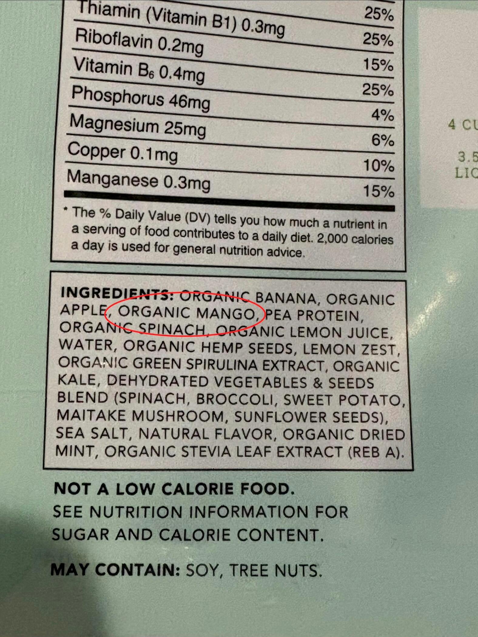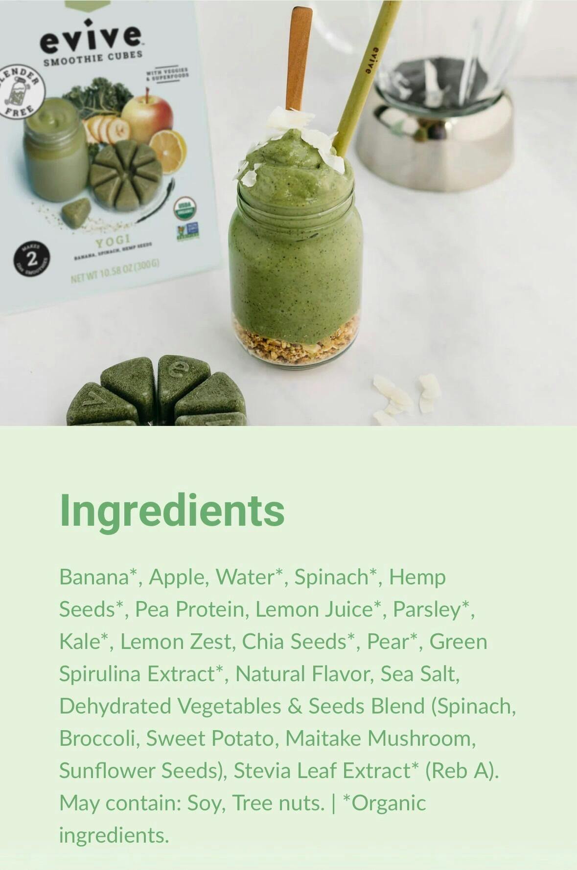 Banana*, Apple, Water*, Spinach*, Hemp Seeds*, Pea Protein, Lemon Juice*, Parsley*, Kale*, Lemon Zest, Chia Seeds*, Pear*, Green Spirulina Extract*, Natural Flavor, Sea Salt, Dehydrated Vegetables & Seeds Blend (Spinach, Broccoli, Sweet Potato, Maitake Mushroom, Sunflower Seeds), Stevia Leaf Extract* (Reb A). May contain: Soy, Tree nuts. | *Organic ingredients.